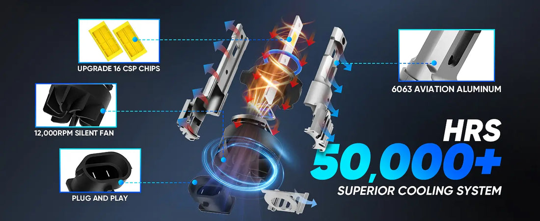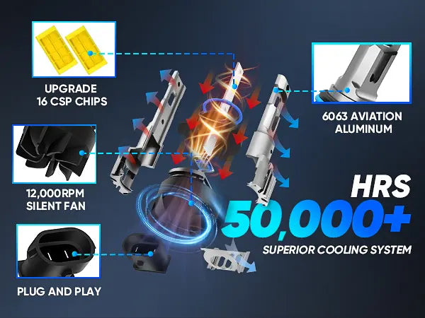 • 50000 Hours-Aluminum construction and turbo fans ensure up to 50,000 hours of service life, equivalent to 100 halogen bulbs.