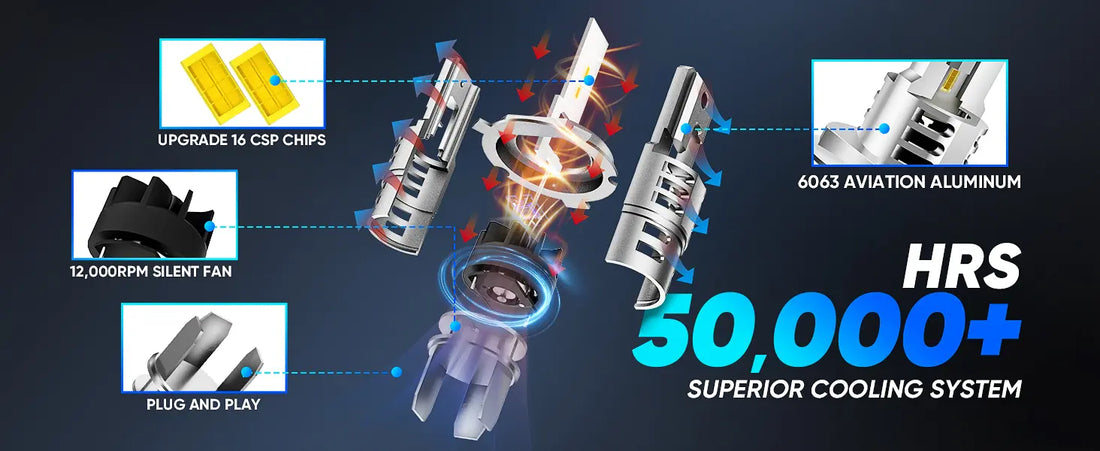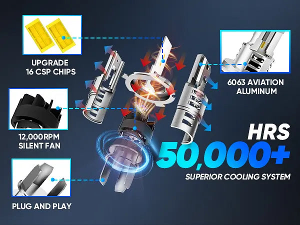 • 50000 Hours-Aluminum construction and turbo fans ensure up to 50,000 hours of service life, equivalent to 100 halogen bulbs.